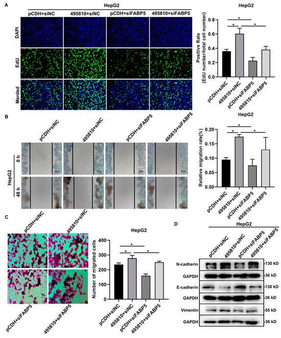 FABP5 mediates the promoting effect of lncRNA495810 in HCC cells. (A) The cell proliferation was analyzed by Edu assay after HepG2 cells were cotransfected with empty plasmid (pCDH + siNC) or lncRNA495810 overexpression plasmid (495810 + siNC) and FABP5 siRNA (siFABP5). The proliferation capacity of HepG2 cells was determined by Edu assay (×200). (B,C) The effect of cell migration was analyzed by wound healing assay (B) and Transwell assay (C) after HepG2 cells were cotransfected with empty plasmid (pCDH + siNC) or lncRNA495810 overexpression plasmid (495810 + siNC) and FABP5 siRNA (siFABP5). The migration ability of HepG2 cells was determined by migration assay (×200). (D) The expression of EMT-related proteins was detected using Western blot assay after HepG2 cells were cotransfected with empty plasmid (pCDH + siNC) or lncRNA495810 overexpression plasmid (495810 + siNC) and FABP5 siRNA (siFABP5). * p < 0.05.