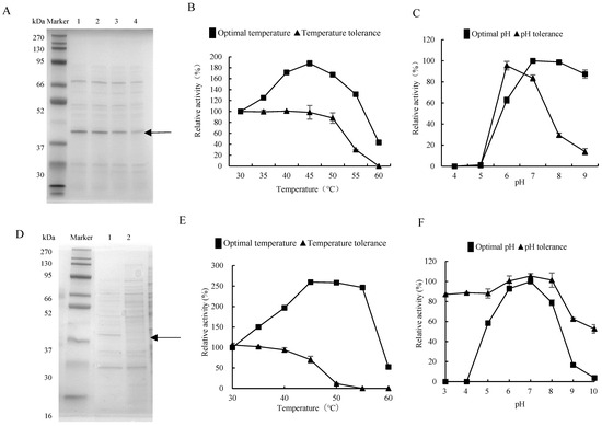 Enzymatic properties of proteases from gut bacteria. (A) SDS-PAGE analysis of the DX-3 proteases with different fermentation durations. Lanes 1–4 were fermented for 44, 36, 28, and 20 h, respectively. (B) Optimal temperature and temperature tolerance of the DX-3 protease. (C) Optimal pH and pH tolerance of the DX-3 protease. (D) Recombinant expression of recombinant plasmid pHT43-htpX in WB800N; 1: IPTG induction for 44 h; 2: without IPTG induction, 44 h. (E) Optimal temperature of the DX-3-htpX protease. (F) Optimal pH of the DX-3-htpX protease. The values represented the average of three independent experiments.