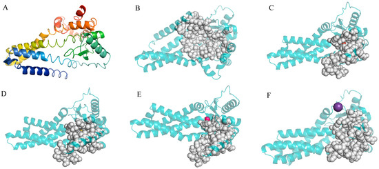 The three-dimensional structure and D3 pocket of the DX-3-htpX protease and its binding to different ions are shown by PyMOL. (A) The three-dimensional structure of the DX-3-htpX protease is shown as a cartoon and colored with a rainbow spectrum (N-terminal was purple, C-terminal was red). (B) The active site of the DX-3-htpX protease. (C) The active site of the DX-3-htpX protease binding to Ca2+. (D) The active site of the DX-3-htpX protease binding to Zn2+. (E) The active site of the DX-3-htpX protease binding to Cl−. (F) The active site of the DX-3-htpX protease binding to K+.