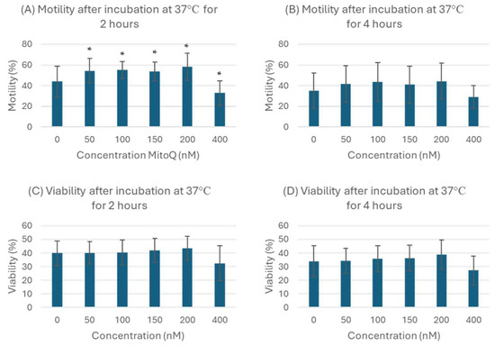 Effect of different concentrations of MitoQ on sperm motility (A,B) and viability (C,D) after incubation at 37 °C for 2 h and 4 h. Data are presented as mean ± standard deviation, n = 16. * indicates that the p value is < 0.05, which means that the values are significantly different.
