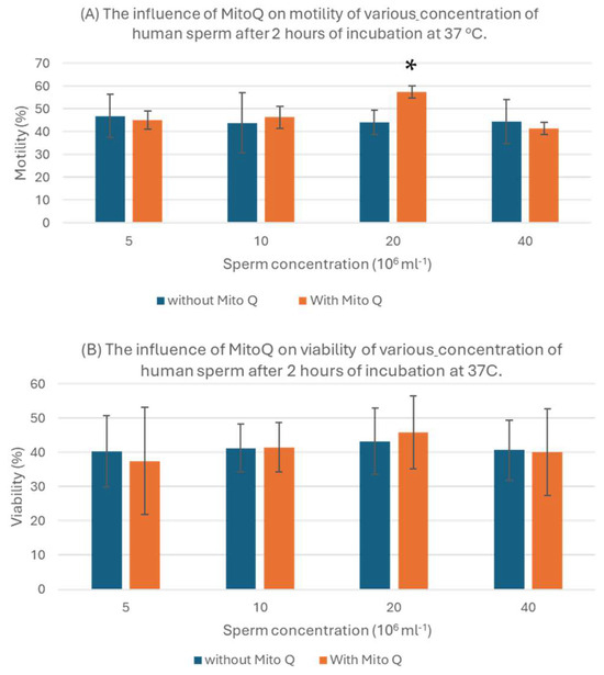 Semen samples from twelve donors were prepared to a final concentration of 5, 10, 20 and 40 × 106 sperm/mL. Every concentration from every sample was divided into two tubes, supplemented with either 200 nM MitoQ or PBS. After 2 h of incubation at 37 °C, the motility and viability of the sperm were measured (Figure 2). Sperm concentration 20 × 106 sperm/mL was the sperm concentration in which sperm motility was most efficiently enhanced in samples supplemented with 200 nM MitoQ (p < 0.05). The motility of sperms in the other sperm concentrations (5, 10, 40 × 106 sperm/mL) was not enhanced by supplementation of 200 nM MitoQ (Figure 2A). None of the sperm concentrations (5, 10, 20, 40 × 106 sperm/mL) affected the viability of sperms after incubation with 200 nM MitoQ (Figure 2B).