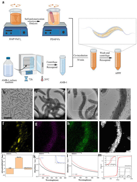 The preparation of APPF was conducted as illustrated in Figure 1a. Fe-ion-doped PDAP-Fe was synthesized in aqueous solution, using FeCl3 as the oxidant and 2,6-diaminopyridine (DAP) as the precursor [26,27]. Subsequently, purified AMB-1 was co-incubated with PDAP-Fe. The PDAP-Fe rapidly absorbed onto AMB-1 (electrostatic interaction), yielding a multifunctional platform, APPF. Transmission electron microscopy (TEM) images showed that the synthesized PDAP-Fe exhibited shuttle-like structures of approximately 40 nm (Figure 1b). The as-formed APPF retained the morphology of AMB-1, and PDAP-Fe coated the AMB-1 evenly (Figure 1c). The volume of APPF was slightly larger than that of AMB-1 because of the coating. No disruption of the membrane structure of AMB-1 was observed in the magnified images (Figure 1d,e). Because PDAP-Fe was the product of Fe ion-driven DAP polymerization and the use of Fe ions was key to the production of APPF, we analyzed the distribution of Fe elements in APPF using dark-field TEM and surface elemental mapping (Figure 1f–i). The results demonstrated a significant distribution of Fe elements on the surface of APPF, mainly in the PDAP-Fe-formed nanocoating and the magnetosomes of the bacteria. The abundant loading of Fe ions provided a foundation for the efficient catalytic activity of CDT in APPF [28]. To study whether the interaction between PDAP-Fe and AMB-1 was an electrostatic interaction, we analyzed their zeta potentials. AMB-1 displayed a mild negative charge before co-incubation, at approximately −16.9 mV, while PDAP-Fe exhibited a positive charge of around 35.4 mV, due to the presence of amino acid groups in its structure. The zeta potential of APPF dropped to −3.2 mV, indicating that AMB-1 and PDAP-Fe neutralized each other and that the adsorption of PDAP-Fe on AMB-1 was indeed electrostatic absorption (Figure 1j).