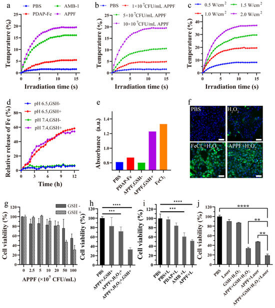 Photothermal performance and Fenton reactions of APPF in vitro. (a) Photothermal performance of AMB−1, PDAP−Fe, and APPF under 808 nm laser irradiation; (b) the heating curve of APPF with different concentrations under 808 nm laser irradiation; (c) the heating curve of APPF under 808 nm laser irradiation at different powers; (d) the curve of Fe ions released from APPF under different pH values and with or without GSH; (e) UV−vis absorbance of TMB and H2O2 solutions incubated with APPF for 20 min at room temperature; (f) confocal microscope images of DCFH−DA−stained 4T1 cells 3 h after treatment with H2O2, FeCl3 + H2O2 or APPF + H2O2 at pH = 6; (g) the cytotoxicity of APPF in 4T1 cells with or without GSH; (h) the anti−tumor effect of the APPF−catalyzed Fenton reaction; (i) the viability of 4T1 cells treated with APPF under 808 nm laser irradiation; (j) the in vitro synergistic anti−tumor effect of photothermal therapy and chemodynamic therapy using APPF; 4T1 cells treated with PBS alone were used as a control (100% viability). Unless otherwise specified, the concentration of H2O2 was 100 × 10−6 M and the concentration of GSH was 200 μM. ** p < 0.01, *** p < 0.001, **** p < 0.0001.