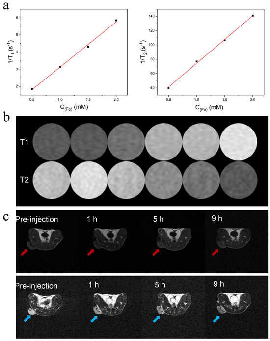 In vitro and in vivo MRI performance of APPF. (a) Plots of 1/T1 and 1/T2 as a function of total metal (Fe) concentrations. (b) T1−weighted MR images (top) and T2−weighted MR images (bottom) of APPF at different concentrations. (c) T1− and T2−weighted MR images of a 4T1 tumor−bearing mouse before (30 min) and after the intravenous injection of APPF. Tumor regions are highlighted by red and blue arrows.