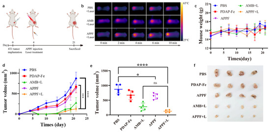 The combined anti-tumor effect of APPF-mediated photothermal therapy and chemodynamic therapy in vivo. (a) Schematic illustration of the treatment schedule. (b) Thermal images of tumor-bearing mice injected intravenously with PBS, AMB-1, or APPF under 808 nm laser irradiation at the indicated time points. (c) Tumor growth curve of mice treated with different protocols. (d) The weight change of the mice in different groups throughout the treatment. (e) Differential analysis of the tumor volume in different treatment groups. (f) Display of the tumor tissue obtained from different treatment groups. The data are shown as mean ± standard deviation (the number of mice in each group was 4 or 5). * p < 0.05, *** p < 0.001, **** p < 0.0001.