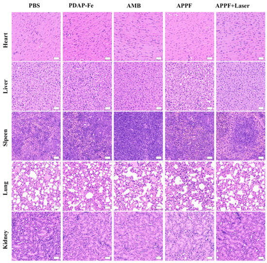 Biosafety assessment of APPF, showing the post-treatment H&E morphology evaluation of the isolated main organs collected from the mice. The scale bar is 100 nm.