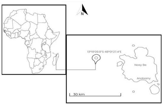 Observations and data collection of the grey reef shark aggregation were carried out by the Sharks Studies Center—Scientific Institute of Massa Marittima (GR, Italy) and Manta Diving Nosy Be in Madagascar, in the waters near the island of Nosy Be (13°18′54.07″ S; 48°15′33.34″ E) in the Indian Ocean (Mozambique Channel). The average water temperature along the coast of Nosy Be is 28.1 °C, with a minimum of 25.5 °C in August and a maximum of 30.5 °C in February (SeaTemperature.org, earthobservatory.nasa.gov/global-maps/MYD28M). The photo-ID study was conducted at the site “Mokarran” (13°19′09.08″ S, 48°01′27.04″ E), at a depth between 15 and 30 m (Figure 1). The study area is characterized by a coral reef, a typical formation of tropical oceans with a high rate of biodiversity and consisting of biogenic rocks fed by the sedimentation of organisms with a calcareous skeleton. This site has a slight slope at a depth between 15 and 30 m, and then gradually flows into a sandy plateau with a depth of over 2000 m.