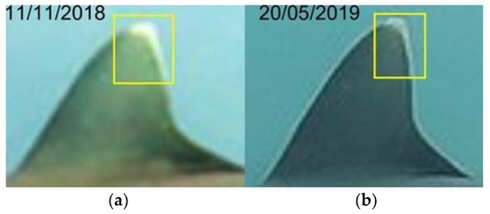 Identification area of the first dorsal fin in the same grey reef shark over time, years 2018 (a), 2019 (b) (resighting 6).
