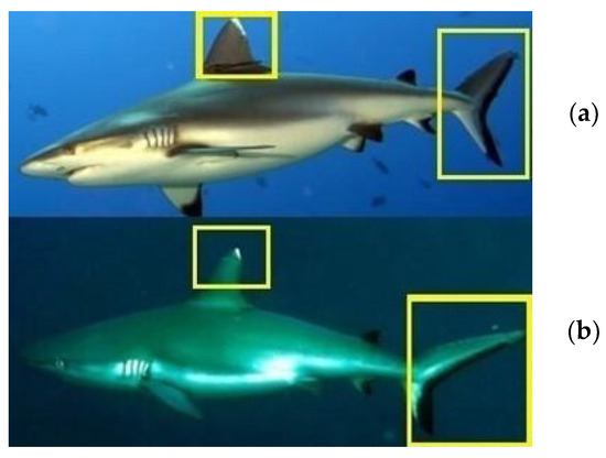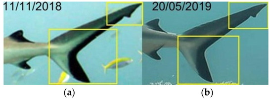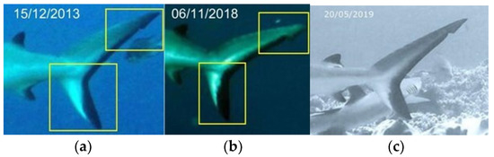 Comparison areas, in the dorsal fins and caudal fins, choosed to identify different grey reef sharks over time (a,b).