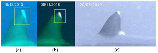 Identification area of the caudal fin in the same grey reef shark over time, years 2013 (a), 2018 (b) and 2019 (c) (resighting 1).