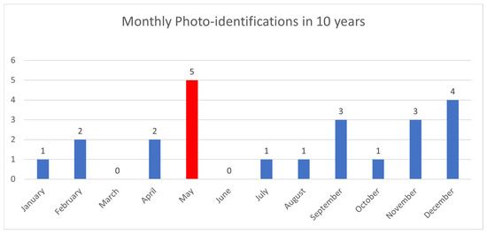 Monthly frequency of photo-identified specimens of C. amblyrhynchos in 10 years. May (red column) was the month with the highest peak sightings (n = 5).