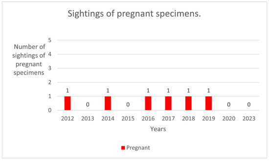In the sampling area “Mokarran,” in the 10 years between 2012 and 2023 (except the years 2021 and 2022), a total of about 1000 h of underwater observations by scuba diving were completed. Of the 54 sightings documented during this period, only 23 C. amblyrhynchos specimens were identified (Figure 8, Table 1), and both sides were photographed for only 3 specimens; 16 specimens were captured from the left side and 4 were captured from the right side. Specimens observed and identified were all females indicating a sex ratio of 1:0 and shark size ranged between 50 cm and 180 cm in TL. The yearly identification peak was observed in 2018 and 2019, while monthly peak sightings were observed in May and November (Figure 9). A total of eight resightings were observed, with the longest being recorded more than 5 years later after 1982 days (Figure 6, Figure 7 and Figure 10; Table 2). In total, six likely pregnant females were photo-identified (Figure 11) and specimen number 2, sighted from 2013 to 2019, was probably pregnant in 2018 (Figure 9). A few juveniles around 50 cm in TL were sighted during the 10 years of observations (personal comment E. Venanzi). To have a better chance of encountering sharks, the opposite current seems to favor the ascent and aggregation of C. amblyrhynchos toward the upper edge of the coral reef, thus favoring close observation of the animals (personal comment E. Venanzi) [39].