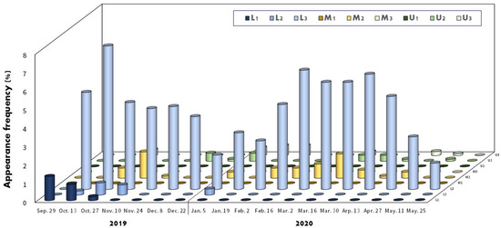 Appearance frequency of A. rhombeus embryos in eight parts of gill demibranch inside the mussel. The color bars indicate the position of U1, U2, U3, M1, M2, M3, L1, L2, and L3, respectively.