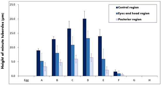 The minute tubercles on the embryos were examined in three regions: EHR, MR, and PR. Their heights are shown in Figure 5 and Figure 6. The tubercles, which were hemispherical, appeared immediately at stage A in all three regions. The height of tubercles in the MR was as follows: 0 µm in the egg stage, 8.9 µm (4.1–15.0 µm) in stage A, 12.8 µm (7.0–19.0 µm) in stage B, 16.6 µm (10.5–22.4 µm) in stage C, 20.1 µm (15.4–24.3 µm) in stage D, 13.9 µm (6.0–21.0 µm) in stage E, 1.5 µm (0–4.0 µm) in stage F, and 0 µm in stage G and H.
