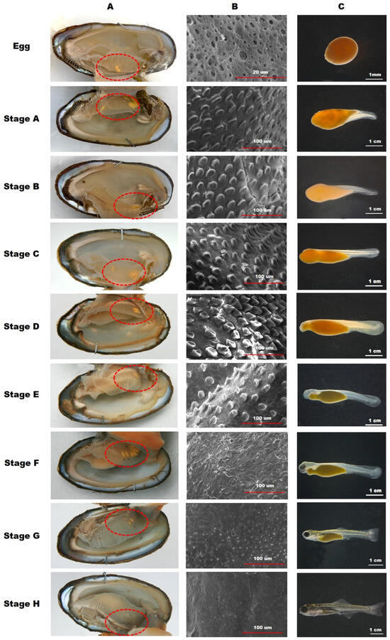 Position of A. rhombeus embryos inside the mussels. (A), development of minute tubercles on the skin surface; (B), and morphological characteristics; (C), after the embryonic development stage. The dotted circle indicates the position of embryos inside mussels.