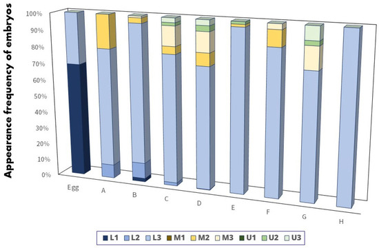 Reactivation stages (E–H) were predominantly observed in L3. Stage-E embryos were mainly located in L3 (97.0%; n = 65), with sporadic occurrences in M2 and U2. Stage-F embryos were primarily observed in L3 (87.1%; n = 27) and M2 and M3. Stage-G embryos were notably present in L3 (75.7%; n = 28) and M3, U2, and U3. Stage-H embryos were exclusively observed in L3 (100%; n = 15).