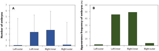 Regarding the spatial configuration of the embryos, 143 and 29 mussels contained A. rhombeus embryos in one and two gills, respectively. No mussel contained A. rhombeus embryos in three or four gills. The frequency of embryos in each of the four gill parts was 1.5% in the left outer gill (n = 3), 45.8% in the left inner gill (n = 92), 49.3% in the right inner gill (n = 99), and 3.5% in the right outer gill (n = 12; Figure 8B). Embryos were significantly more prevalent in the two inner parts than in the outer parts of the gill demibranchs, although no differences were observed among the four gill parts (Fisher exact test; p < 0.001).