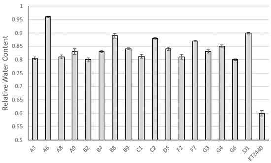 Relative water content of pepper plants subjected to drought and inoculated with different bacterial isolates. Relative water content of plants subjected to drought and inoculated with different isolates. The name indicated on the axis refers to the strain used. Only plants presenting values greater than 0.8 are displayed. Controls of plants inoculated with the drought-protectant Microbacterium koreensis 3J1 and the non-protective control, Pseudomonas putida KT2440, are also shown.