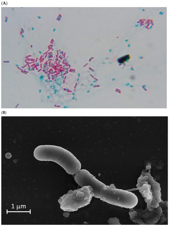 Optical, transmission, and scanning microscopy of the A6 isolate. Spore, endospore, and vegetative cell forms of isolate A6 cultured on TSB for 24 h. (A) Optical microscopy image, ×1000 magnification, where spores and endospores are stained with malachite green stain and appear light blue/green, while vegetative cells are stained with safranin and appear pink/red. (B) Scanning electron microscopy of vegetative cells of strain A6. (C) Transmission electron microscopy of spores of the A6 strain, showing the ultrastructure’s coat, corte, inner membrane, and core. Magnification is shown at the bottom of the electronic microscopy image.
