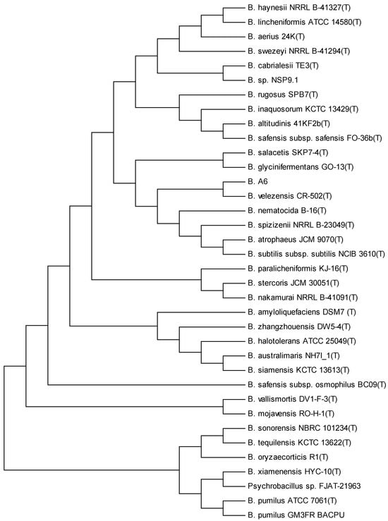 The A6 spore-forming isolate was identified by nucleotide sequencing of the near-complete 16S rRNA gene (1430 bp) (acc. no. PQ099275), which showed that it belonged to the operational group Bacillus amyloliquefaciens (OGBa) [49] and showed similarity to Bacillus siamensis (acc. no. AJVF01000043), B. velezensis (acc. no. AY603658), B. subtilis (acc. no. ABQL01000001), and B. amyloliquefaciens (acc. no. FN597644), with a similarity of 99.93%, 99.92%, 99.78%, and 99.70%, respectively. Due to the peculiarities of this operational group, we decided to sequence the entire genome of strain A6 in order to determine its taxonomic affiliation in a more rigorous way (acc. no. SAMN40153660).