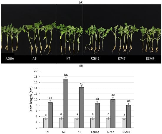 Since members of the OGBa are known as plant-growth-promoting bacteria (PGPB) due to their abilities to fix nitrogen, solubilize phosphates, and produce siderophores and phytohormones, as well as antimicrobial compounds, three commercial strains of the OGBa were included in the study for comparison, including the B. amyloliquefaciens DSM7 strain Fukumoto, B. amyloliquefaciens FZB42, and B. amyloliquefaciens D747. A tray with 31-day old pepper plants was purchased and inoculated with bacterial suspensions of the three commercial strains plus B. velezensis A6 separately, and the dry weights of the plants were measured at time 0 and 31 days after inoculation (Figure 4). Although plants inoculated with the four Bacillus strains showed a higher dry weight than the control in the absence of microorganisms, in the case of plants inoculated with DSM7, the differences were not significant. On the other hand, the strains FZB42 and D747 induced plant growth to a significantly higher extent than that observed in non-inoculated plants—to a level similar to that shown by plants inoculated with the PGPR P. putida KT2440—while plants inoculated with the A6 strain showed the highest values for stem and root length and dry weight. Strains that produced a combined increase in root and stem size greater than the control without bacteria under irrigated conditions were considered PGPR, while strains that produced an increase in dry weight as well as relative water content in the absence of irrigation, as observed in non-inoculated plants, were considered protective against drought.