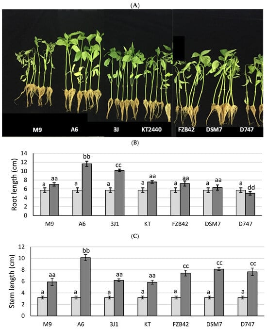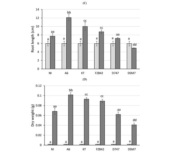 Tomato plants treated with different Bacillus strains under biostimulation conditions. Appearance of the plants inoculated with the different Bacillus strains at 31 days after inoculation. (A) Stem length (B), root length (C), and dry weight of the plants (D) are represented for each group of plants at 0 days (represented in light gray) and at 31 days (represented in dark gray) after inoculation. Significant differences are indicated by the presence of letters, with one letter corresponding to a period of 0 days and two letters corresponding to a period of 31 days. aa indicates that not there are differences with non-inoculated plants. bb and cc indicate higher dry weight values with respect to non-inoculated plants. dd indicates lower dry weight values than non-inoculated plants.