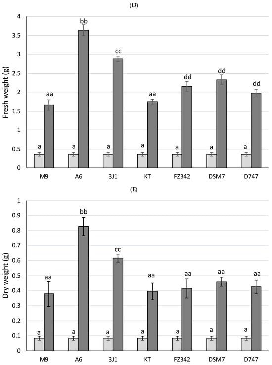 Pepper plants treated with different Bacillus strains under xeroprotection conditions. Appearance of the plants inoculated with the different Bacillus 32 days after sowing (A). Root lengths (B), stem lengths (C), fresh weights (D) and total dry weights (E) are represented for each group of plants at 0 days (represented in light gray) and at 31 days (represented in dark gray). Significant differences are indicated by the presence of letters, with one letter corresponding to a period of 0 days and two letters corresponding to a period of 32 days. aa indicates that not there are differences with non-inoculated plants. bb and cc indicate higher parameter values with respect to non-inoculated plants.
