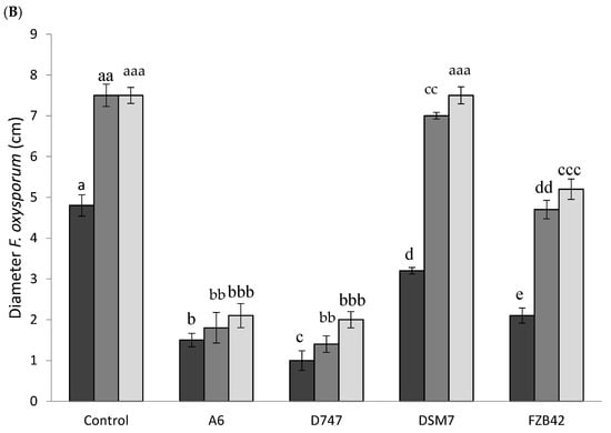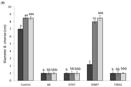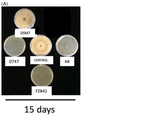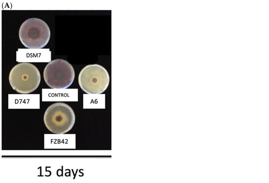 Strains of the OGBa often produce antimicrobials, including antibiotics and fungicides, that protect plants from attack by certain pathogens. To compare the protective capacities of the four Bacillus strains under study, antagonism and antibiosis studies were carried out. These studies were carried out on the phytopathogenic fungi Fusarium oxysporum and Botritis cinerea. All the strains under study showed significant differences in their inhibition of the growth of both tested fungal strains, except in the case of the DSM7 strain at 15 days, where the growth of F. oxysporum was of the same extent as the control in the absence of bacterial inoculation. Although this strain showed some antifungal activity at 5 and 10 days, its effect was the lowest of those observed among the Bacillus strains. The antagonism study against F. oxysporum after five days of testing showed greater fungicidal activity when strain D747 was used than with the rest of the strains. The second strain with the highest antifungal activity was A6, which showed similar antifungal activity to D747 at 10 and 15 days. They were followed in antifungal efficiency by strain FZB42 and, finally, by DSM7, as we have indicated previously (Figure 6A,B). When testing on B. cynerea, all strains, except DSM7, showed the same remarkable degree of growth inhibition. Again, the DSM7 strain had the lowest inhibitory effect on the growth of B. cynerea, which was only apparent at 5 and 10 days. No significant differences from the control were observed in the absence of bacteria on day 15 (Figure 7A,B).