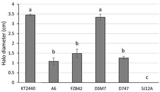 Another advantage that certain PGPR offer is their ability to solubilize phosphorus and potassium salts. The ability to solubilize these salts is measured based on the diameter of the coloured halo generated by a pH indicator. The phosphate solubilization capacity of the four Bacillus strains was evaluated using the SMRS 1 medium. This medium contains bromocresol purple as a pH indicator, so the strains that have the capacity to solubilize phosphates form a yellow halo in the medium. The largest yellow diameter was formed by the DSM7 Fukumoto strain, covering a surface of 3.3 ± 0.15 cm, with no significant differences to that produced by the phosphate solubilizer P. putida KT2440. Strains FZB42, D747, and A6 showed similar values, with no significant differences, ranging from 1.1 to 1.6 cm (Figure 8).