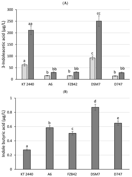 Indole butyric acid (IBA) is another auxin produced by certain bacteria with an important role in plant growth. Similar to the IAA production, in the case of IBA production, DSM7 was the largest producer of this auxin (0.88 μg/L), followed by the other three strains, with values ranging from 0.5 (FZB42) to 0.64 μg/L (D747) (Figure 9B).