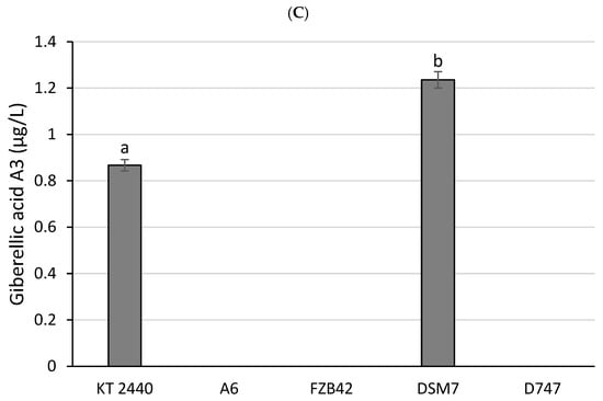 Gibberellic acid is also involved in different plant developmental processes and the regulation of many physiological processes [55]. Once more, it was the DSM7 strain that exhibited the largest production of the plant hormone. In this specific case, it was the only producer of gibberellic acid, with over 1.23 μg/L, which had a level even higher than that recorded for the positive control, P. putida KT2440 (0.87 μg/L). No production of gibberellic acid was detected for the other Bacillus strains (Figure 9C). In all cases, gibberellic acid was only found at 24 h and not at 72 h.