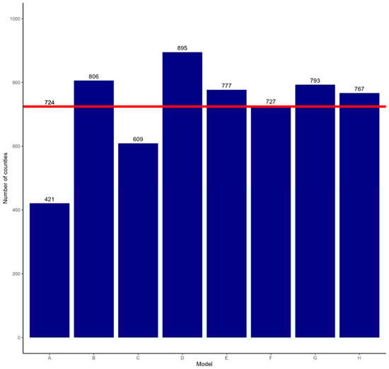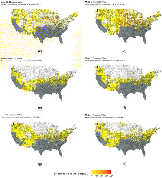 Figure 6 maps the spatial distribution of the value of crops, grasses, and pasture precluded from wild pigs across US counties for each model. Figure 7 maps the mean value of crops, grasses, and pasture resources for each county across all models of wild pigs spread, cumulated across the period from 2014 to 2021. The spatial distribution indicates that a key factor in determining the value of resources safeguarded is the specific counties where wild pigs are predicted to spread. For example, the forecasted spread in model D encompasses areas of states with significant agricultural production, such as Nebraska, Iowa, and Illinois, while the forecasted spread in model F indicates that wild pigs spread to counties in eastern states with lower levels of agricultural production.