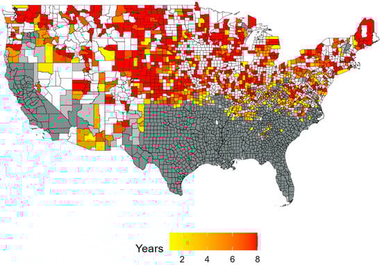 Uncertainty regarding the spread of wild pigs and the extent of the damage resulting from wild pig presence is an additional challenge. The environmental and climatic factors that drive wild pig population growth documented in McClure et al. [] have been influential in predicting their northward expansion []. Once established, Miller et al. [] used watershed-scale modeling to uncover the determinants of wild pig population growth. Regardless, predicting the spread and growth of wild pig populations using ecological modeling utilizes pre-period data and a variety of assumptions. Due to errors in pre-period data, unpredictability in the ecological factors governing wild pig population dynamics, and assumptions inherent to a given modeling strategy, there is a high degree of uncertainty regarding the timing and location of wild pig population growth. Further, information on population densities in observed wild pig habitats is difficult to ascertain, which yields an additional source of uncertainty in spread forecasting. Lastly, the pre-period data used to inform the ecological models did not account for the international expansion of invasive wild pigs from Canada or Mexico. Notwithstanding, in all models we evaluated, the extent of the spread of wild pigs and the magnitude of the associated resources safeguarded are considerable.
