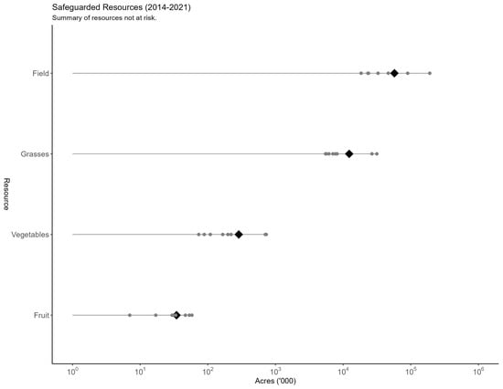 Summary of fruit and vegetable acreage safeguarded from additional years of wild pig presence. Gray points represent each model forecast of fruit and vegetable acreage and black diamonds represent the mean acreage for each fruit and vegetable resource. Acreage is scaled logarithmically. Acreage is cumulative over the period spanning 2014 to 2021.