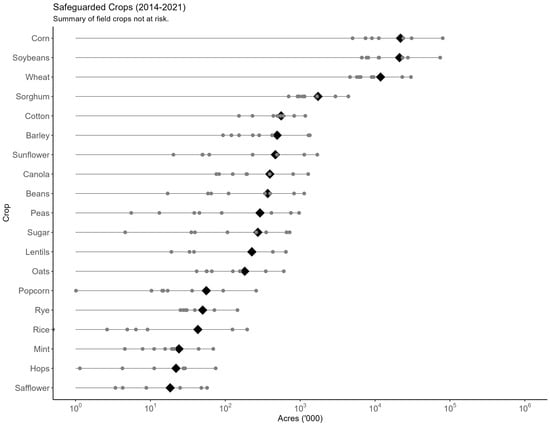 Summary of field crop acreage safeguarded from additional wild pig presence. Gray points represent each model forecast of crop acreage and black diamonds represent the mean acreage for each field crop. Acreage is scaled logarithmically. Acreage is cumulative over the period spanning 2014 to 2021.