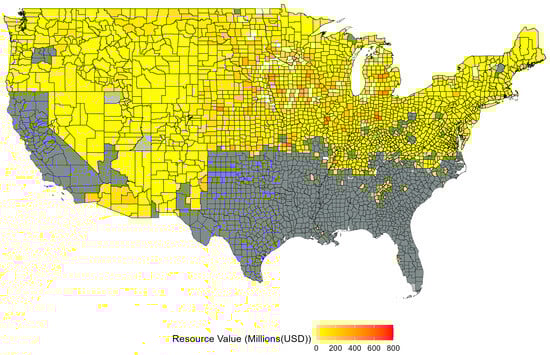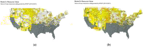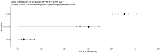 For each model, we computed the total amount of resources for which the threat from wild pigs is averted. We refrained from estimating the value of damages to resources; though surveys have been conducted to estimate the rate of damages from wild pigs in 11 southern states [,], extrapolating these results to other regions is impracticable. Employing data on prices and yields, we then calculated the total value of resources safeguarded from wild pig presence due to the introduction of the NFSDMP. We calculated the value of resources safeguarded for each county and year and then aggregated these values across all years and counties for each model. The resulting value is presented for each broad category of resources and is available for each individual resource.