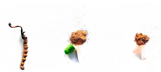 - Chioza, A.; Ohga, S. A Comparative Study on Chemical Composition and Pharmacological Effects of Paecilomyces hepiali and Wild Ophiocordyceps sinensis. Adv. Microbiol. 2014, 4, 839–848. [Google Scholar] [CrossRef][Green Version]