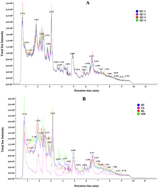 (A) Total ion chromatograms (TIC) of QC (quality control) with untargeted metabolomics LC-MS/MS technology. (B) TIC of QC, GL, BL, and JSB.