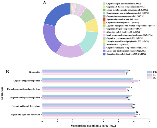 The metabolites were detected in GL, BL, and JSB. (A) Metabolic classification (superclass) of GL, BL, and JSB. (B) The quantitative value expression of the top 6 superclasses in the 3 samples. The ANOVA analysis shows that different lowercase letters indicate significant differences between samples at the 0.05 level.