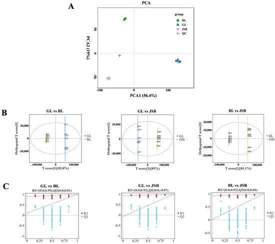 Multivariate statistical analyses of metabolites detected in GL, BL, and JSB. (A) PCA analyses of GL, BL, JSB, and QC. (B) OPLS-DA scores of GL, BL, and JSB. (C) OPLS-DA permutation test of GL, BL, and JSB.