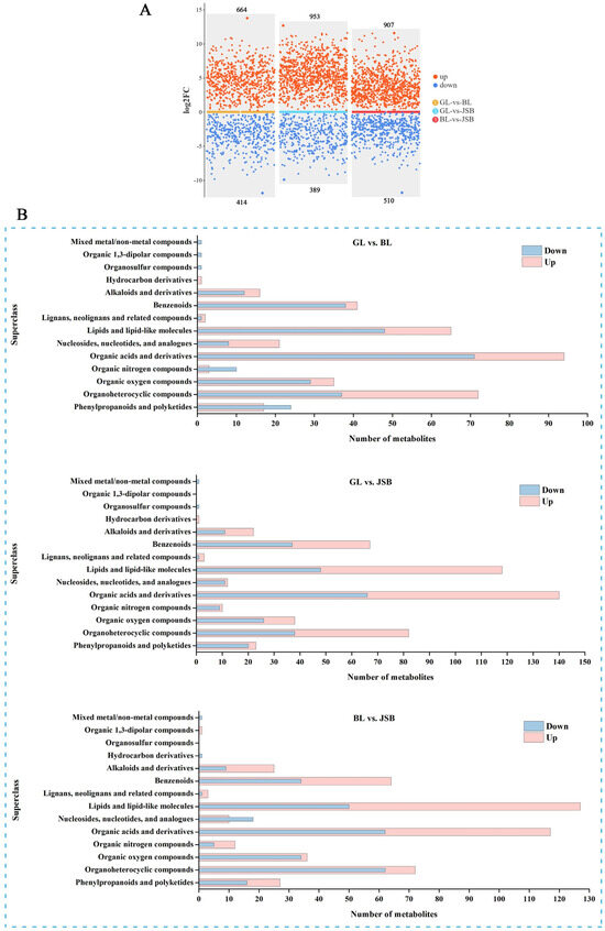 The DAMs analysis of the GL, BL, and JSB. (A) Difference scatter plots of GL, BL, and JSB. Red points indicate VIP ≥ 1 and p < 0.05, representing upregulated differential metabolites (log2_FC > 1); blue points indicate VIP ≥ 1 and p < 0.05, representing downregulated differential metabolites (log2_FC < −1). Larger points indicate higher VIP values of the metabolite, and the three colored bars in the middle represent the three comparison groups. (B) The superclass classification of DMs in the pairwise comparison between GL and BL, GL and JSB, and BL and JSB.