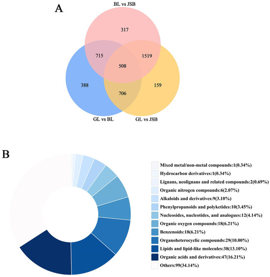 (A) Venn diagram of metabolites detected from GL and BL, GL and JSB, and BL and JSB. (B) Superclass classification of the 508 key metabolites.