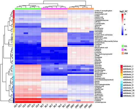 Top 58 hierarchical cluster analysis (HCA) between GL, BL, and JSB. Redder colors indicate higher metabolite abundance; bluer colors indicate lower metabolite abundance.