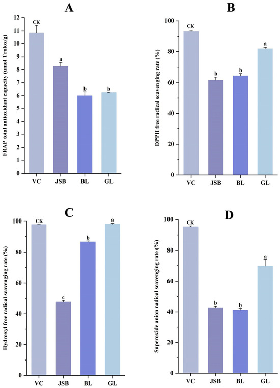 Comparison of antioxidant activity between GL, BL, and JSB. Ascorbic acid (VC) was a control sample and was abbreviated as CK. (A) Ferric ion-reducing antioxidant power (FRAP), (B) 2,2-diphenyl-1-picrylhydrazyl radical scavenging ability (DPPH•), (C) hydroxyl free radical scavenging capacity (•OH), (D) superoxide anion radical scavenging capacity (O2•−). The ANOVA analysis shows that different lowercase letters indicate significant differences between samples at the 0.05 level.