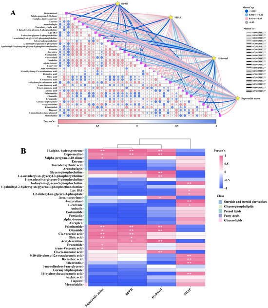 Mantel test and Pearson correlation analysis were employed to investigate the relationship between DPPH•, FRAP, •OH, O2•−, and these key DMs. The Mantel test results indicated significant correlations between DPPH•, FRAP, •OH, and O2•− with multiple lipid DMs (Figure 9A). The correlation heatmap illustrates that the DMs of most fatty acyls (e.g., palmitamide and oleamide) and steroids and steroid derivatives (e.g., depo-medrol and 16-α-hydroxyestrone) exhibit a positive correlation with DPPH•, •OH, and O2•−. Fatty acyls like ricinoleic acid, 16-hydroxyhexadecanoic acid, and falcarindiol, as well as glycerophospholipids including Lpc 18:1, 1-oleoyl-sn-glycero-3-phosphocholine, and 1,2-dioleoyl-sn-glycero-3-phosphate, are positively correlated with FRAP (Figure 9B). The abundance of these DMs is generally in line with the trends observed in DPPH•, FRAP, •OH, and O2•− in various samples (Figure 10A,B).