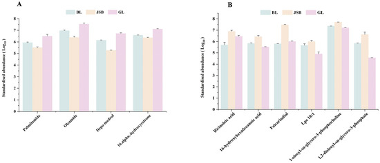 Among the numerous differential metabolites, we identified the top 58 metabolites with high VIP values for further visual analysis. Our results revealed that these metabolites can be categorized into 12 subclusters (Figure 7). The results showed that lipid metabolites (oleic acid, palmitic acid, oleamide, acetyl coenzyme a) and organic acid metabolites (domoic acid, fructoselysine, glutamic acid, glutamine, Ll-2,6-diaminoheptanedioate) were significantly expressed in the GL. JSB exhibited the highest expression abundance of lipid metabolites (Lpc 18:1, 4-oxoretinol, dehydroabietic acid, linolenic acid, falcarindiol) and organic acid metabolites (nateglinide, g-guanidinobutyrate, asp-arg). Additionally, creatinine and homocitrate showed higher expression abundance among the amino acids in BL. The DMs of GL, BL, and JSB predominantly reside within lipids and organic acids, offering valuable insights for identifying potential biomarkers.