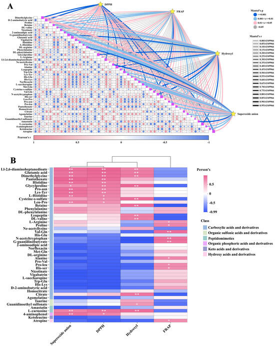 Comparison of antioxidant activity between GL, BL, and JSB. (A) Interactive Mantel test correlation heatmap analysis of DPPH•, FRAP, •OH, O2•−, and key organic acids and derivatives. (B) The inter-group correlation heatmap analysis of DPPH•, FRAP, •OH, O2•−, and key organic acids and derivatives. The vertical coordinate is DMs, and the horizontal coordinate is the 4 antioxidant indicators. **, p values < 0.01. *, p values < 0.05.