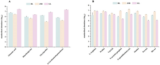 The VIP value of the first principal component in the OPLS-DA model serves as an indicator of the strength of influence of each metabolite content on the sample. The combination of t-test with a significance level of p < 0.05 and VIP > 1 is utilized to identify differential metabolites and auxiliary markers between different groups, aiding in the process of metabolite screening [55,56]. The scatter plot visualization results reveal that there are 1078 DMs (664 upregulated and 414 downregulated) between GL and BL, 1342 DMs (953 upregulated and 389 downregulated) between GL and JSB, and 1417 DMs (907 upregulated and 510 downregulated) between JSB and BL (Figure 5A). We found that BL exhibited significant upregulation of organoheterocyclic compounds, organic acids and derivatives, nucleosides and analogues, hydrocarbon derivatives, lipids compounds, and so on. GL contained a higher proportion of organic nitrogen compounds and phenylpropanoids and polyketides. JSB showed significant upregulation of organoheterocyclic compounds, organic oxygen compounds, organic acids and derivatives, lipids compounds, and so on. However, BL had higher quantities of hydrocarbon derivatives and nucleosides and analogues compared to JSB (Figure 5B).