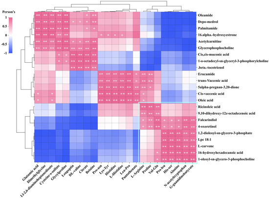 Correlation analysis of key lipid metabolites and key organic acids and derivatives. The vertical coordinate is key lipid metabolites; horizontal coordinate is key organic acids and derivatives. **, p values < 0.01. *, p values < 0.05.