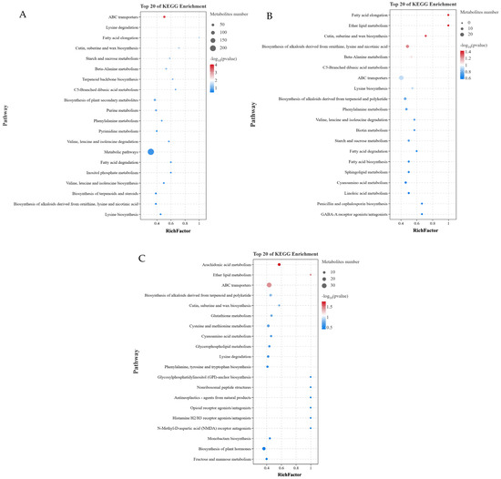 Enrichment analysis of DMs between GL, BL, and JSB using the KEGG database. The top 20 pathways with the lowest p value were mapped; the vertical coordinate is the pathway, the horizontal coordinate is the enrichment factor (the number of differential metabolites in this pathway divided by all the quantities in this pathway), the size represents the quantity, and the redder the color, the higher the p value. (A) GL vs. BL, (B) GL vs. JSB, (C) BL vs. JSB.